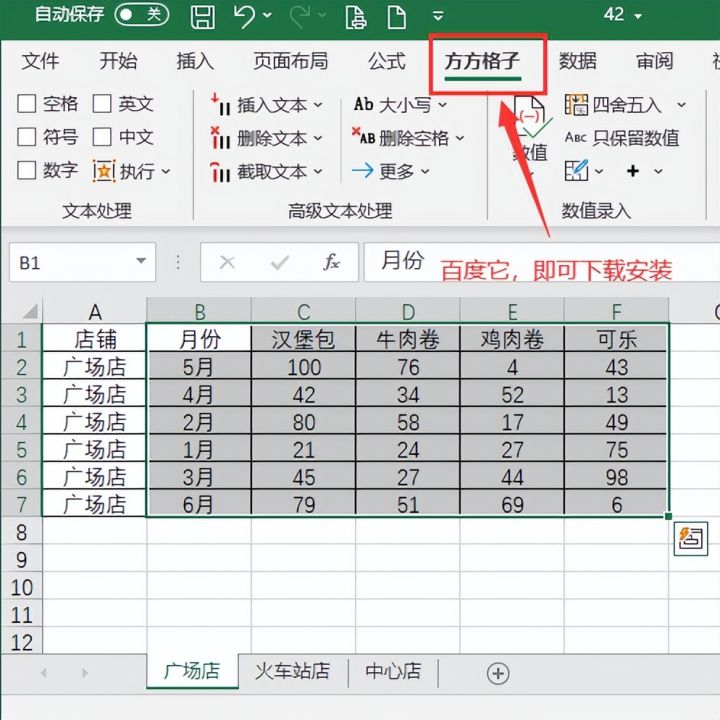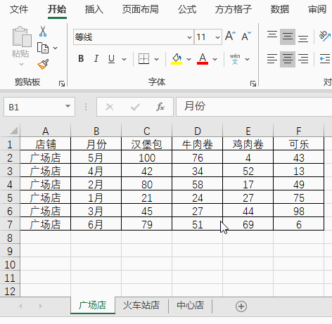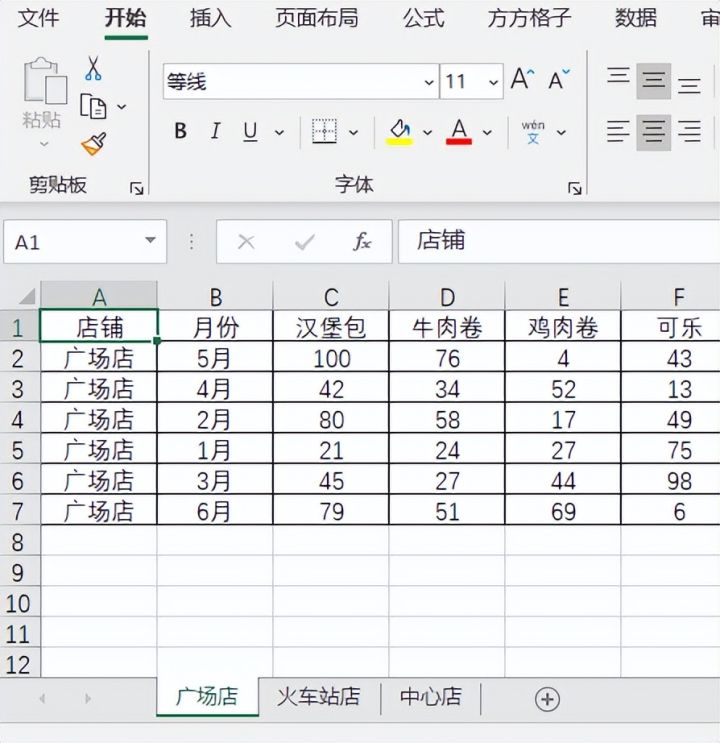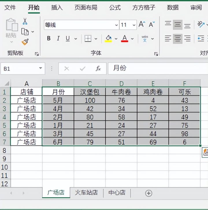 1.如下图是某公司三个店铺的产品销售表,现在我们想要快速汇总出该公司三个店铺每个月的产品总销量。