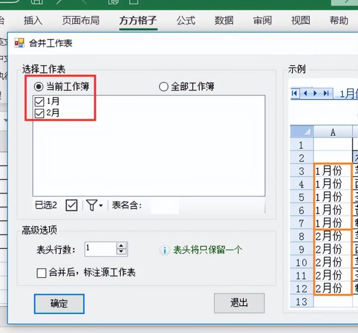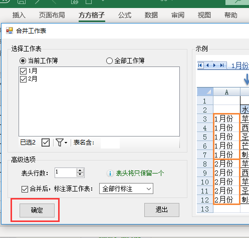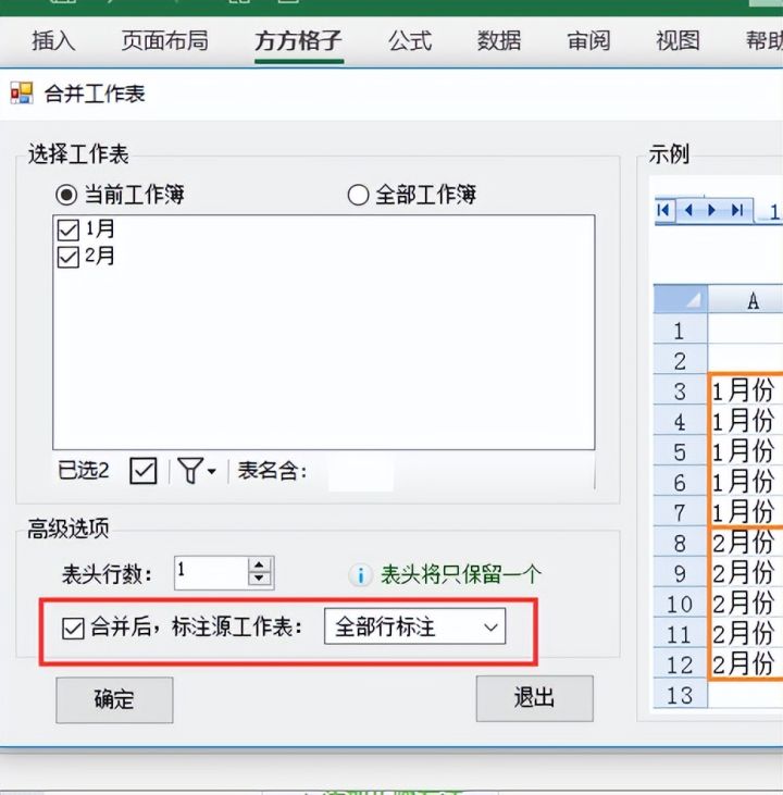 6.勾选【合并后,标注源工作表】,然后选择【全部行标注】