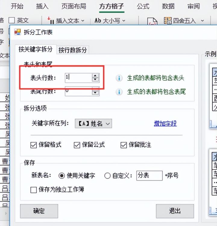 4.在【表头行数】菜单项内输入1