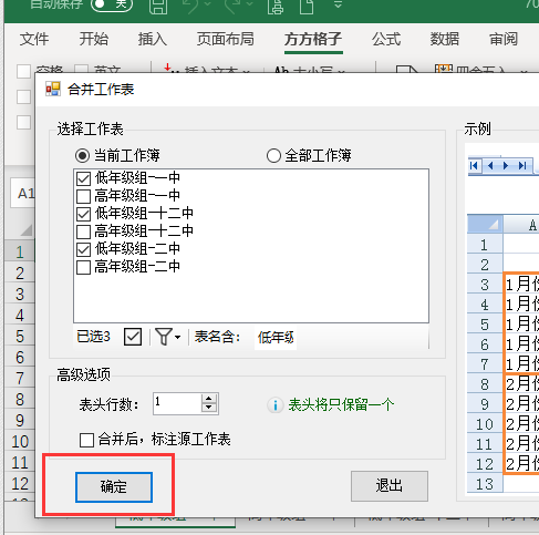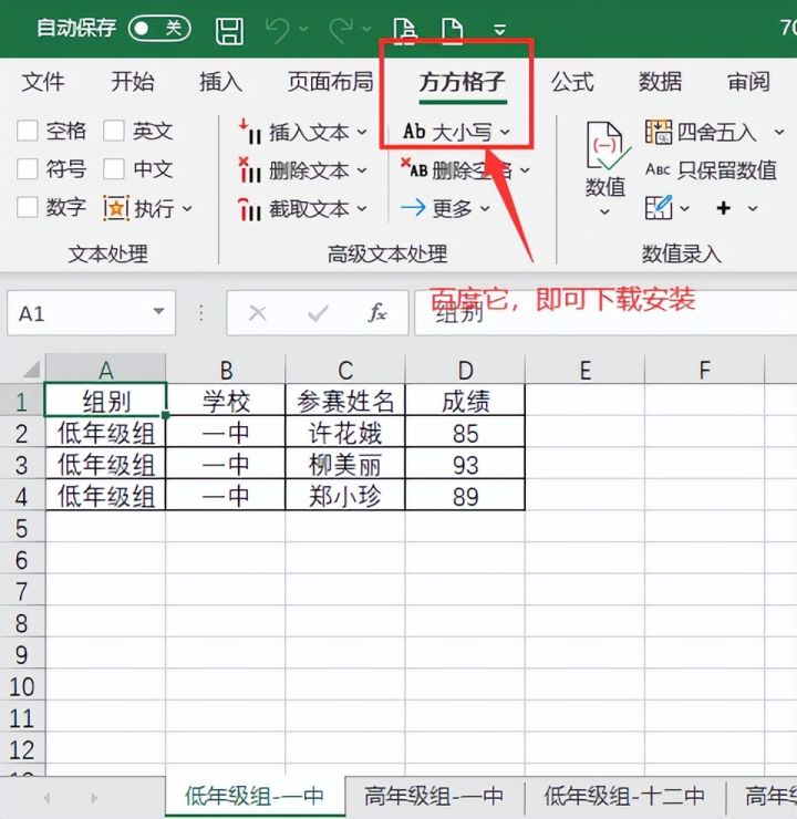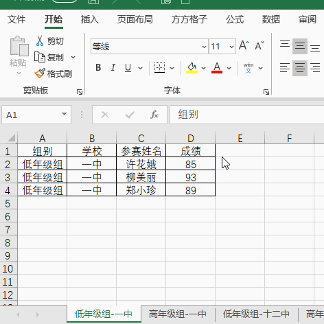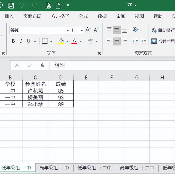1.如下图工作簿中含有多个工作表,现在我们想要将所有低年级组的数据整合到一个表格中。