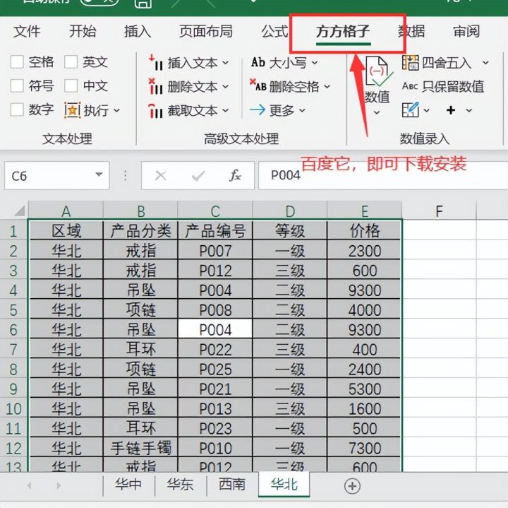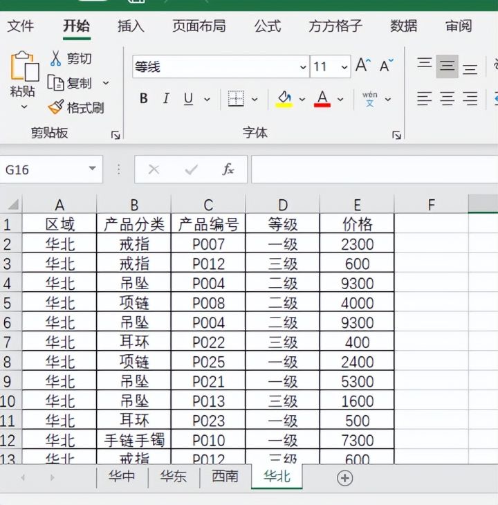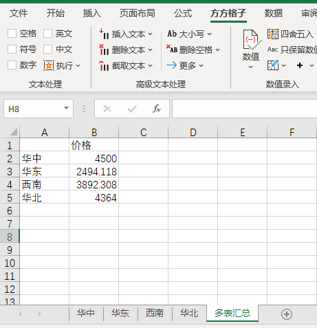 1.如下图含有四个表格分别是某公司四个区域产品定价表,现在我们想要快速汇总出这四个区域销售产品的平均值。
