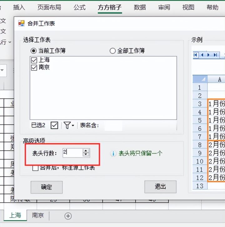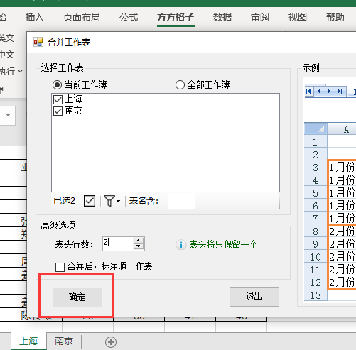 这篇博客介绍了如何使用Excel工具箱中的‘汇总拆分’功能,轻松合并两个分店的月报表。只需几步简单操作,包括点击‘合并多表’,设置表头行数为1,然后确认,就能将数据整合到一个表格中,提高工作效率。