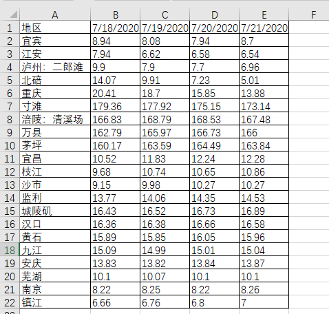 1.如下图是最近几日长江水位情况表,现在领导要求我们快速将各个地区不同日期的水位数据整合到一个表格中。