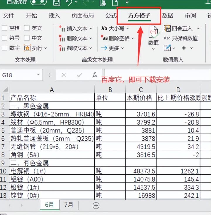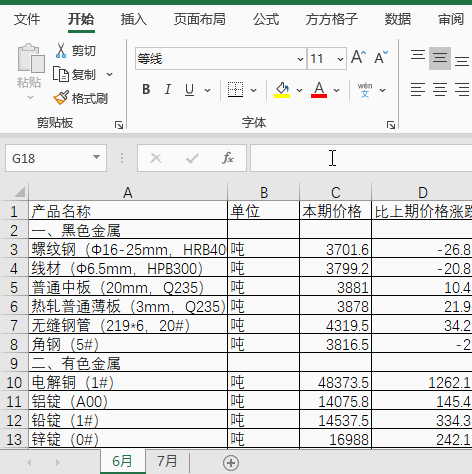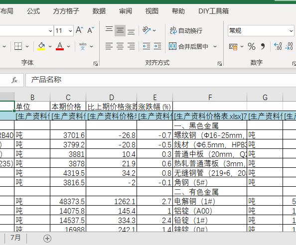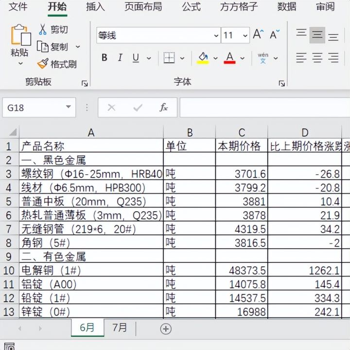 1.如下图分别是6月份和7月份生产原料价格表,现在我们想要将这两个表格横向合并到一个表格中。