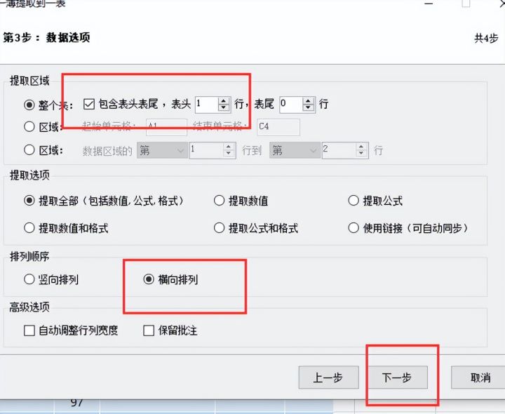 6.勾选【包含表头表尾】然后将表头设置为1,接着点击横向排列,然后选择下一步