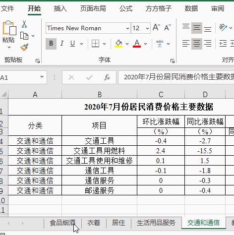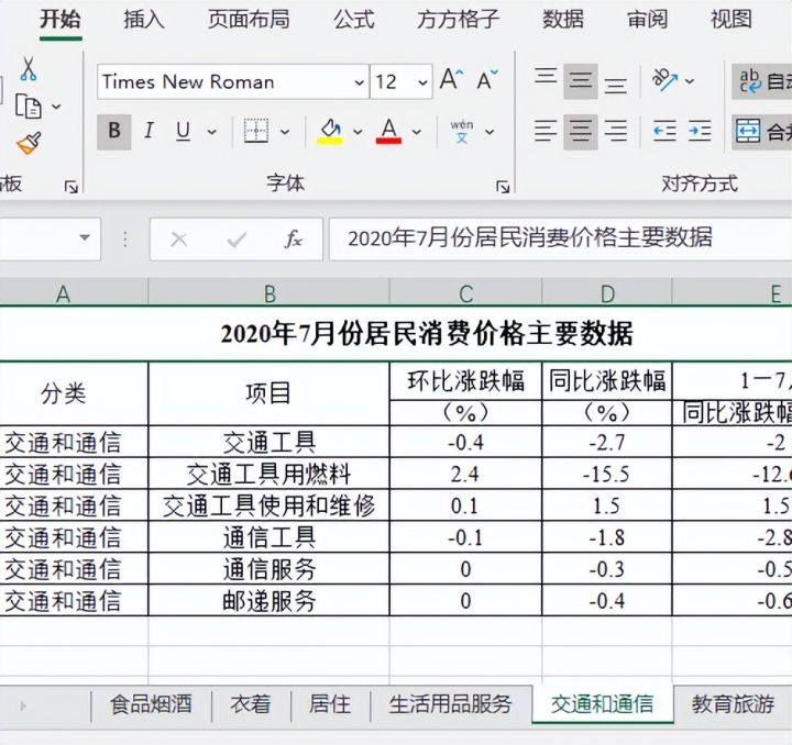 1.如下图是2020年7月份居民各个方面主要消费的价格报表,为了方便领导查看我们想要将这些数据整合到一个表格中。