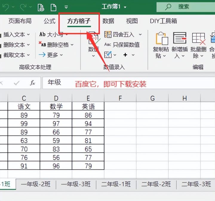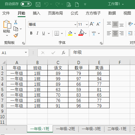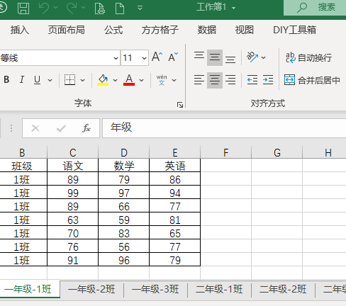 1.如下图表格中含有多个工作表,现在我们想要将1年级信息数据整合到一个表格中。
