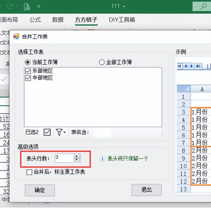 6.将表头行数设置为3,最后点击【确定】即可完成