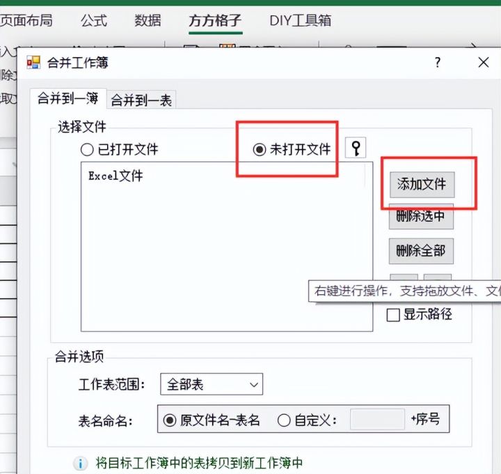 5.勾选【未打开文件】,然后点击【添加文件】将Excel表格添加进去
