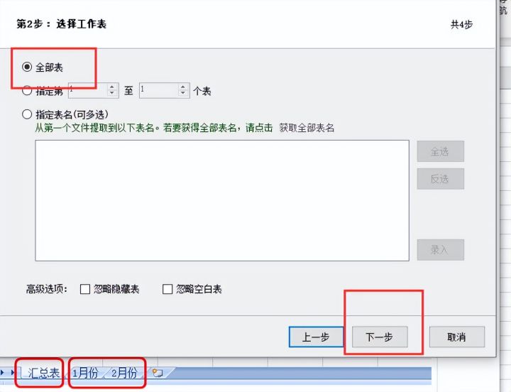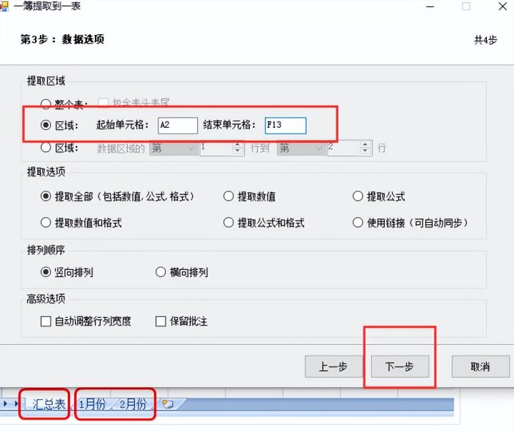 7.勾选【区域】,然后录入要合并的单元格区域,然后点击【下一步】