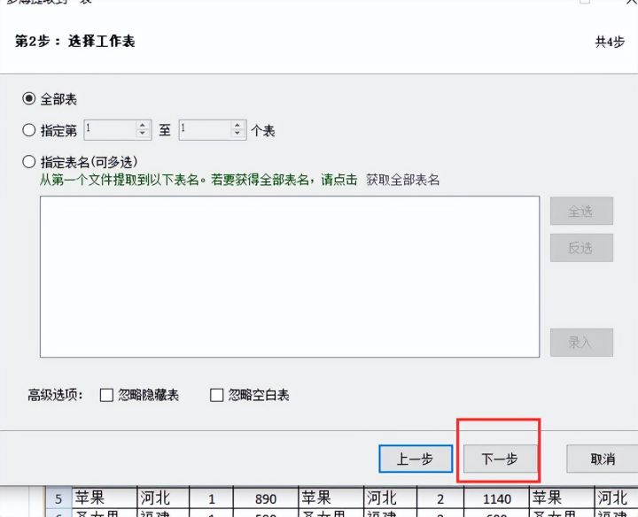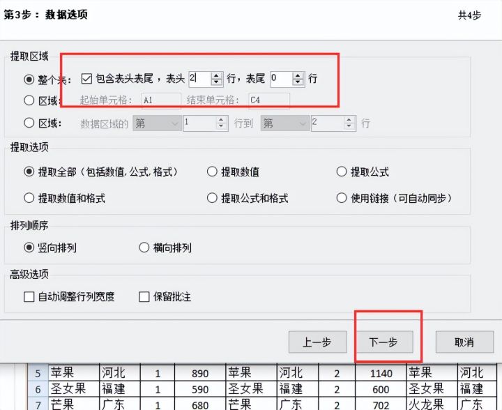 7.点击【包含表头表尾】,然后将表头设置为2行,接着点击下一步