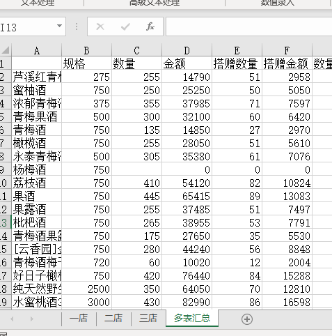 1.如下图是某公司多个店铺销售情况,现在我们想要将这三个店铺销售情况进行汇总。