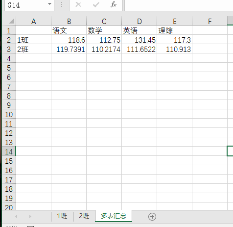 1.如下图,是两个班级考试成绩表,领导要求我们快速汇总出两个班级各个科目考试成绩平均分