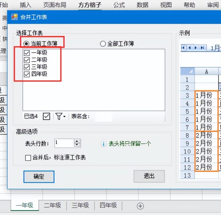 6.将【表头行数】设为1.然后点击【确定】即可完成。