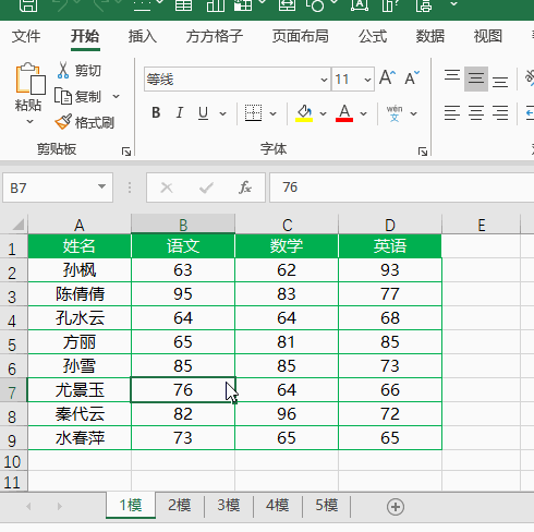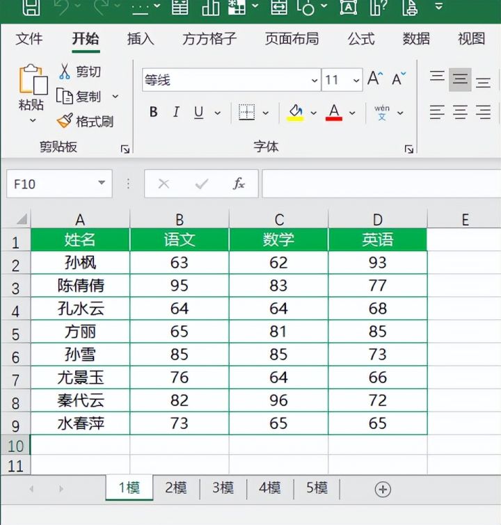 1.如下图是某班级五次模拟考成绩表,现在我们想要快速统计出各位同学五次模拟考各学科的平均分。