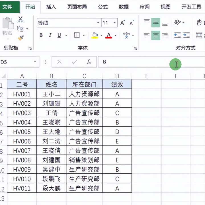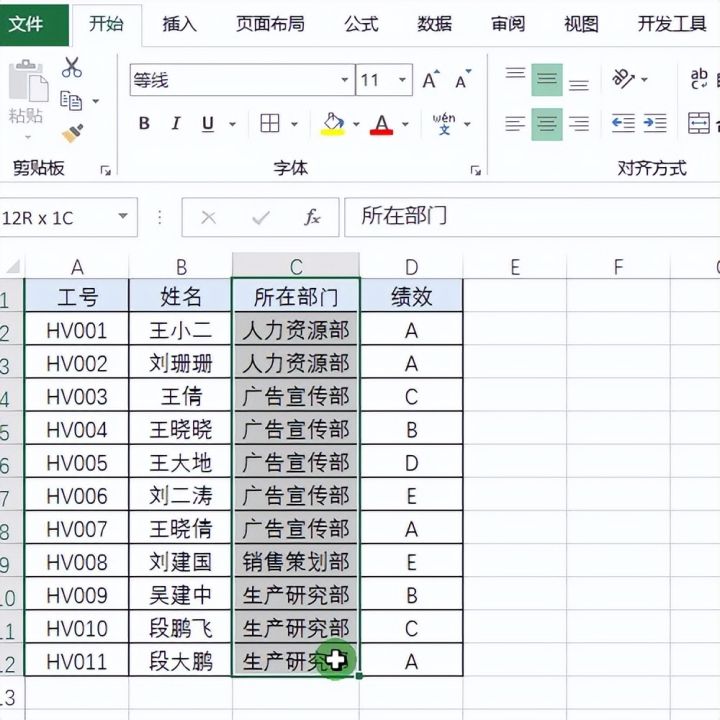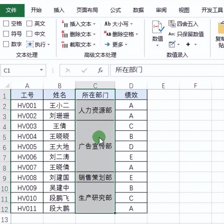 在实际工作中呢,我们可能会遇到这样的问题。就比如说下图,我们需要将所在部门相同的部门进行单元格的合并。而且相同的部门,有2个相同的部门,有5个相同的部门,有3个相同的部门等等,那么我们怎么样来快速的实现合并操作呢?