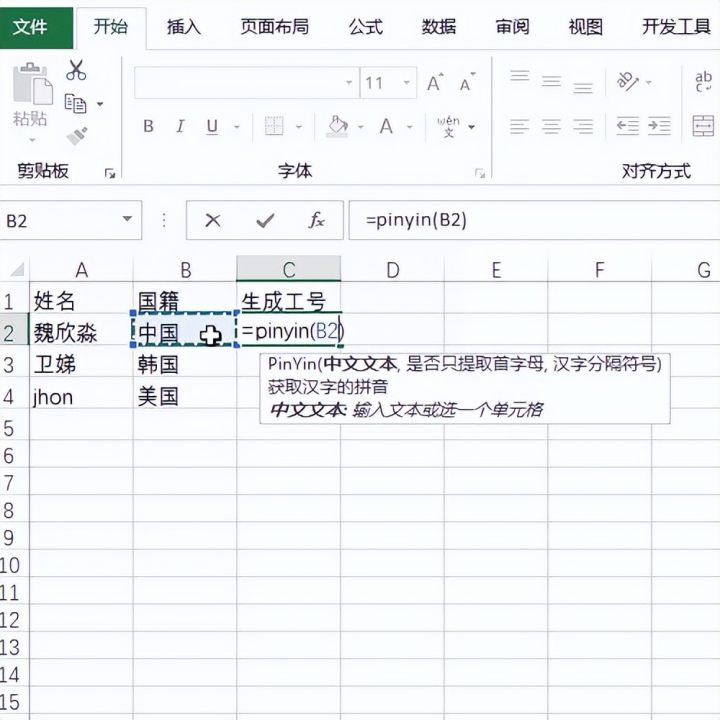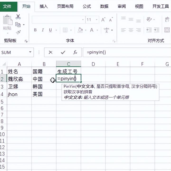 2.好分解动作第一步就是输入pinyin函数,注意这里不是Excel自带的函数,而是函数扩展包里的函数