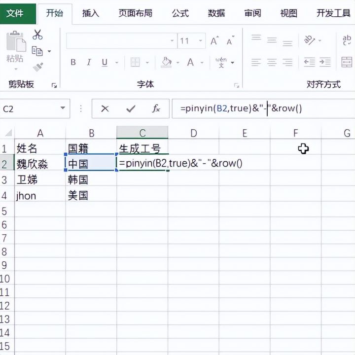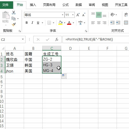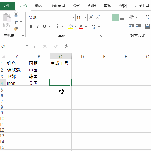 在开始之前,我们需要下载安装方方格子插件的函数扩展包,接着我们看下面的例子,需要获得国籍的首字母信息,然后再分配编号,进行工号设置。