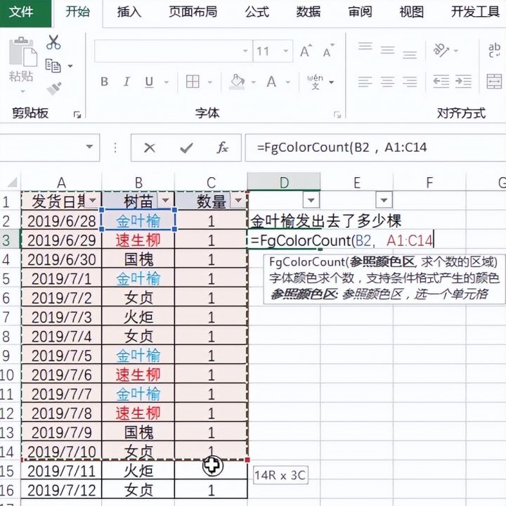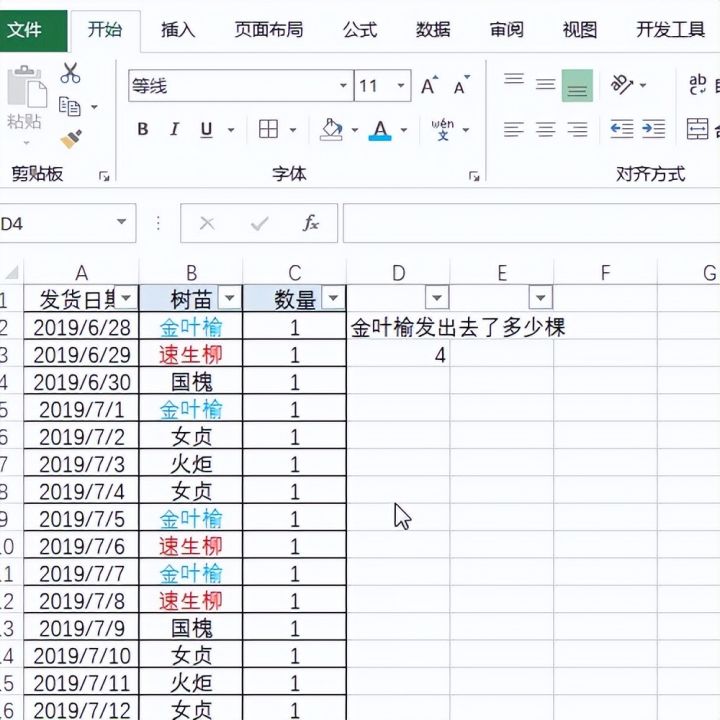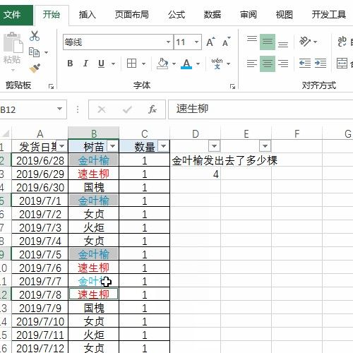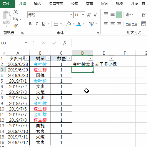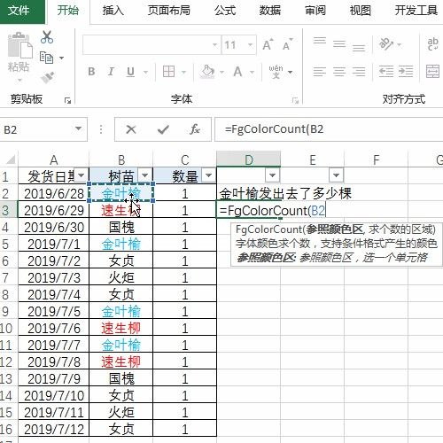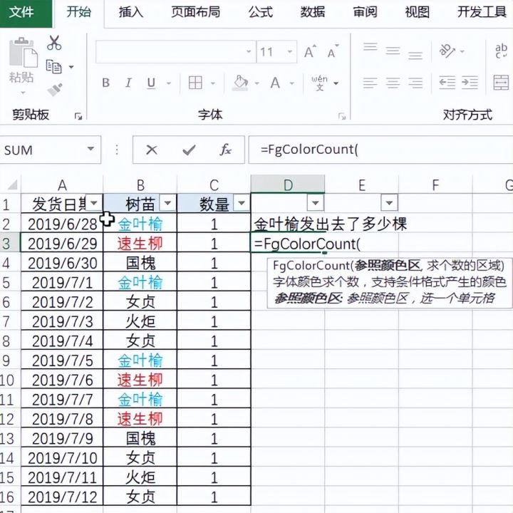 开始之前先下载安装一下方方格子函数扩展包,好了看下图的树苗销售表,想知道,截止目前共销售了几颗金叶榆,有的人说了数一下不就行了,但是这个图表只是举例,如果为1年的数据,难道还1个1个去数吗