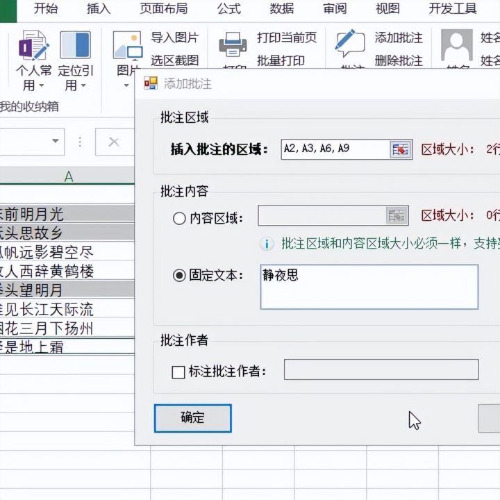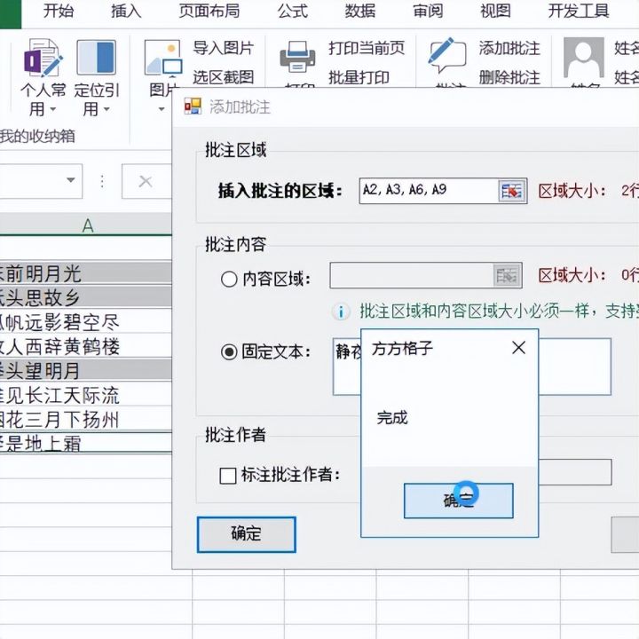 这篇博客介绍了如何使用方方格子插件在Excel中快速为选择的'静夜思'诗句单元格添加相同批注的步骤。通过DIY工具箱选择添加批注功能,输入批注文本,然后确认操作,即可批量完成批注的添加。