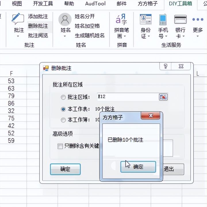 本文介绍了如何使用方方格子插件快速删除Excel工作表中的批注,只需选择DIY工具箱,点击删除批注按钮,然后确认删除操作,即可一键清理所有批注,让工作表更加整洁。