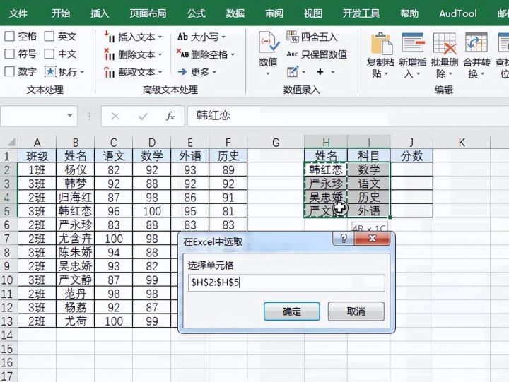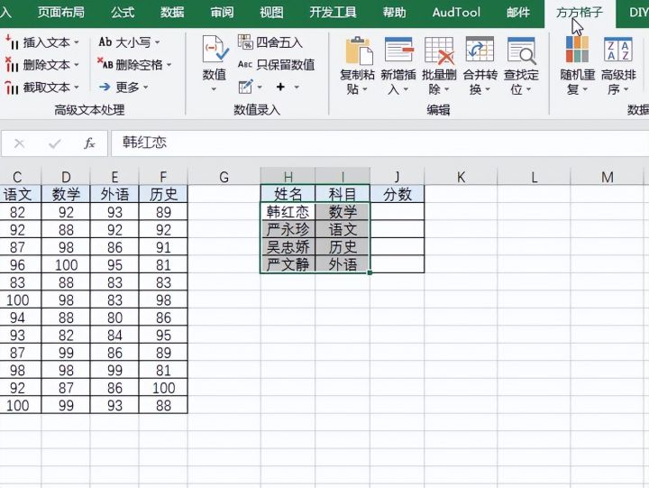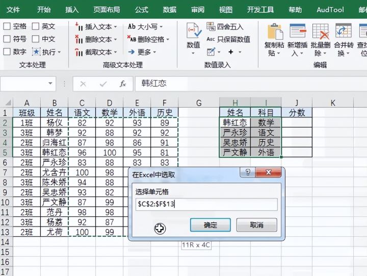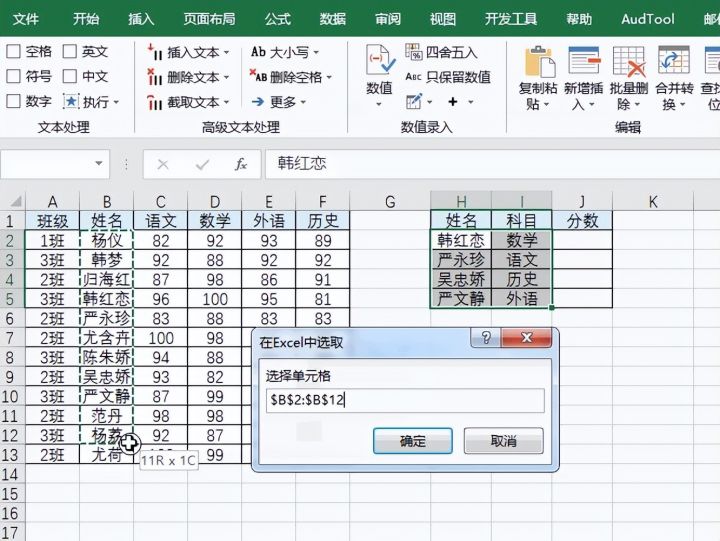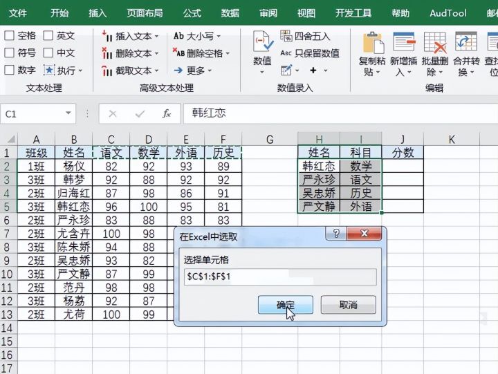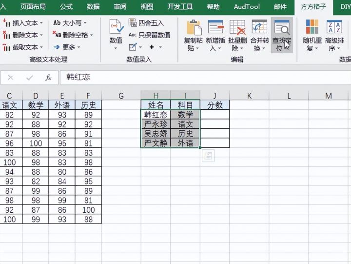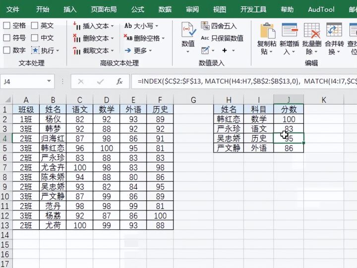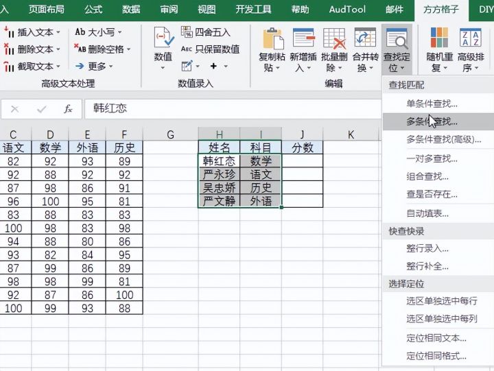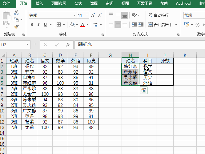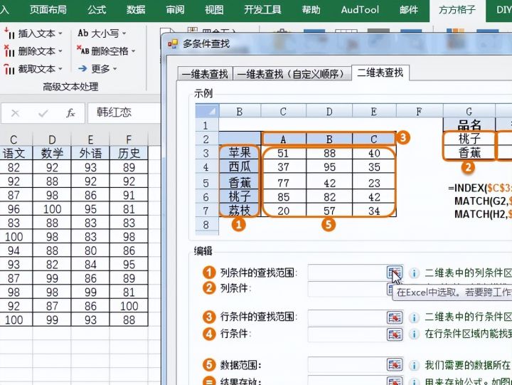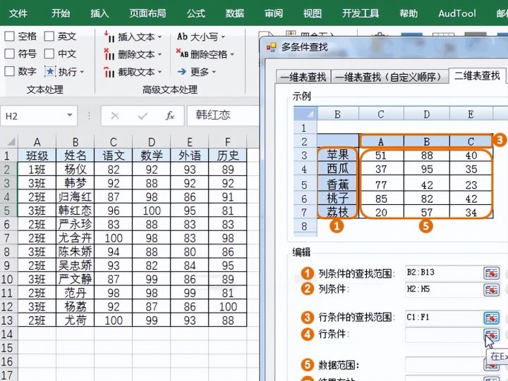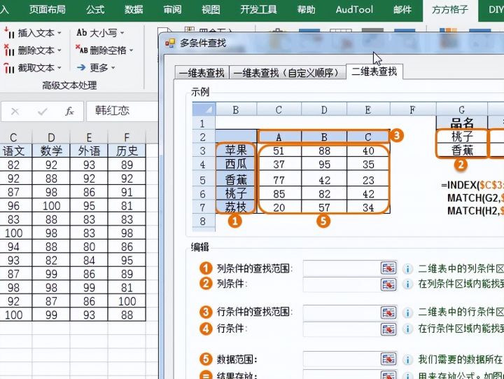 如下图所示左侧为二维表的数据源结构,然后右侧为一维表的查找表,如何通过姓名和学科2个维度进行匹配查找呢,先看小编的动图演示吧