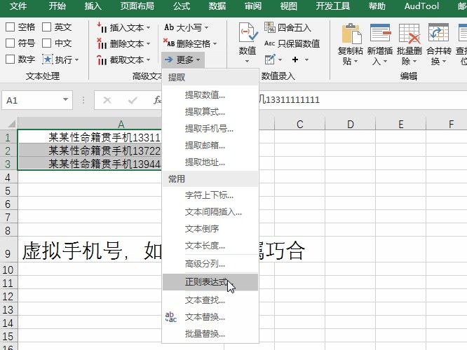 如下图所示,我们想从一串字符中把手机号给提取出来,该如何操作呢,注意这里的手机号是虚拟信息,无其他意图