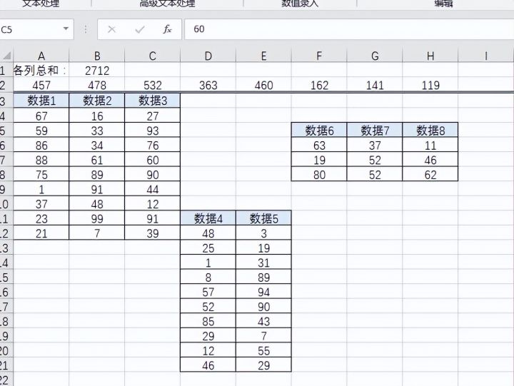 如下图所示一共有3个区域,需要对工作表中各个区域的数据进行一个求和,由于数据不在统一的行和列上所以运用公式很困难,那如何操作呢