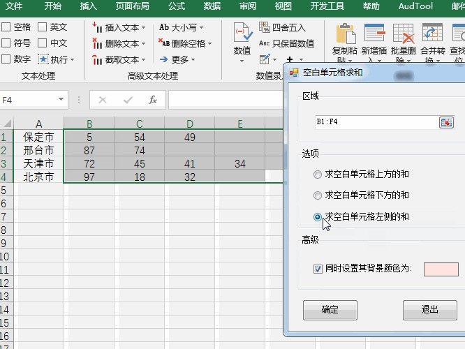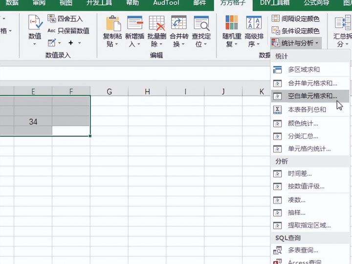 本文介绍了一种在Excel中对空白单元格左侧数据进行快速求和的方法。具体步骤包括:选择空白单元格、点击方方格子按钮、选择统计与分析命令、选择求空白单元格左侧的和等。
