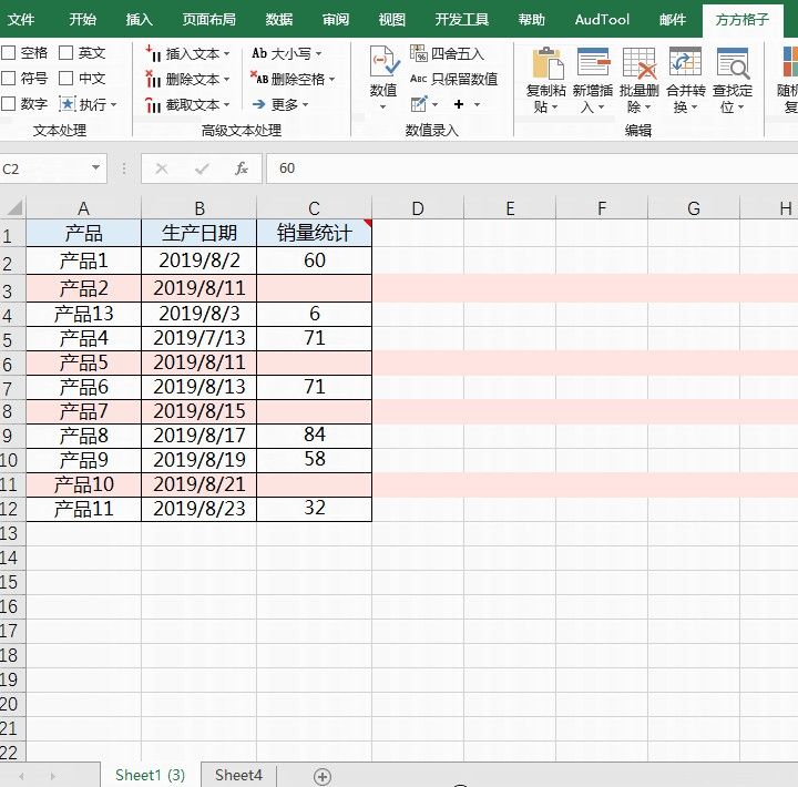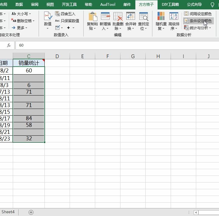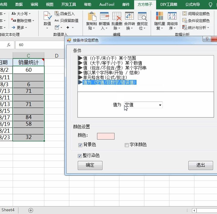 本文介绍使用方方格子插件在Excel中为未统计销量的空白行进行整行背景颜色填充的方法。通过简单的步骤实现对特定条件的行进行视觉标记。