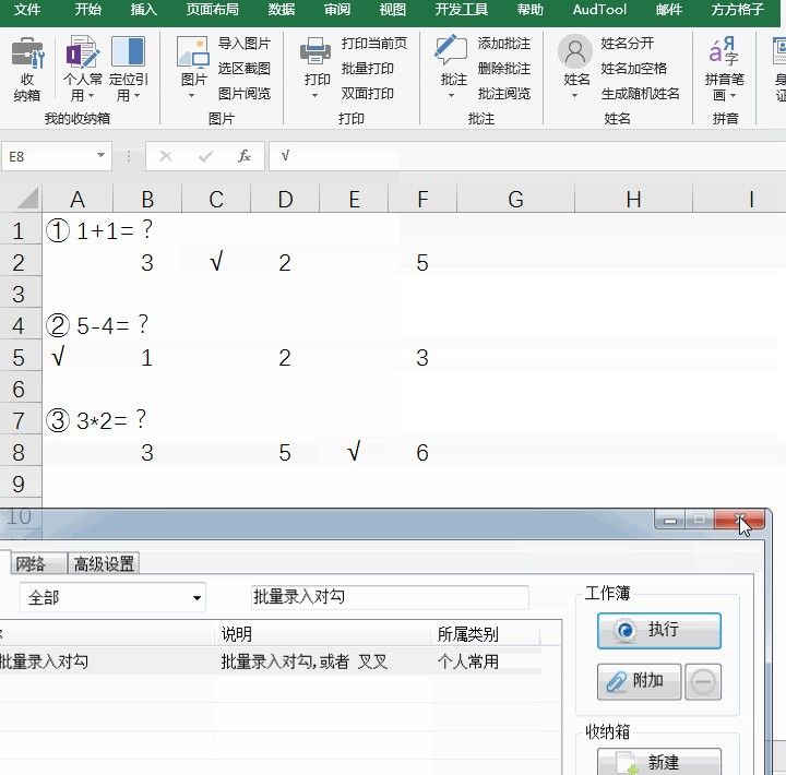 今天小编要和大家分享的是,Excel通过VBA设置在不连续区域输入对号的批量操作,比如说下图的计算题,请在正确答案前画对号
