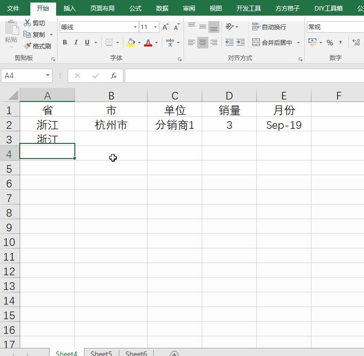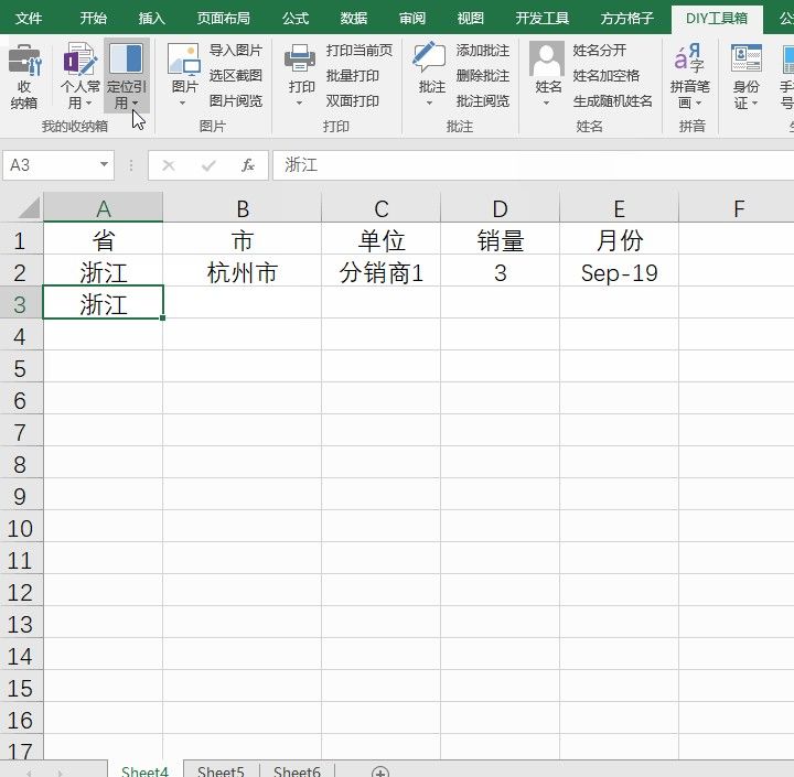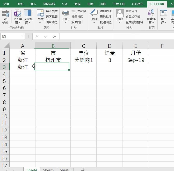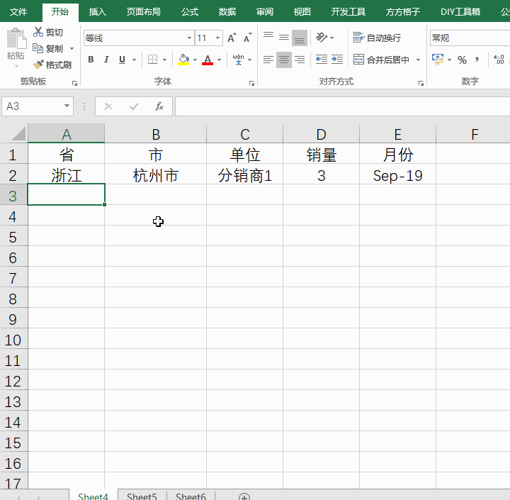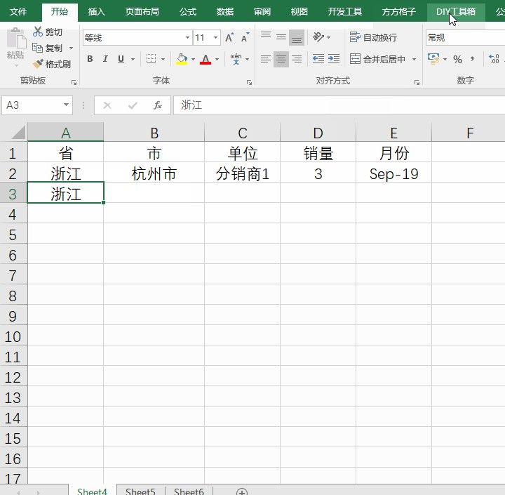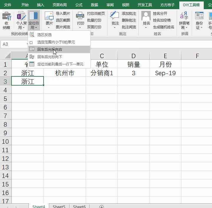 3.为了实现输入数据单击enter后活动单元格右移,我们可以选择方方格子的diy工具箱命令