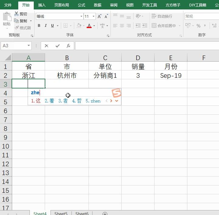 6.设置完成后我们再来试一下,看下图输入浙江单击enter发现活动单元格右移动了,这样我们就可以一条龙输入了