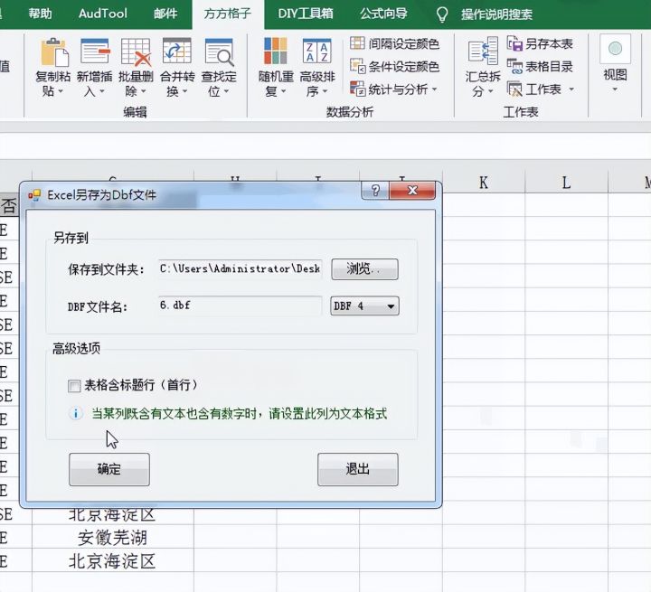 本文介绍如何使用方方格子插件将Excel数据快速转换为DBF文件格式,并提供了详细的步骤说明。