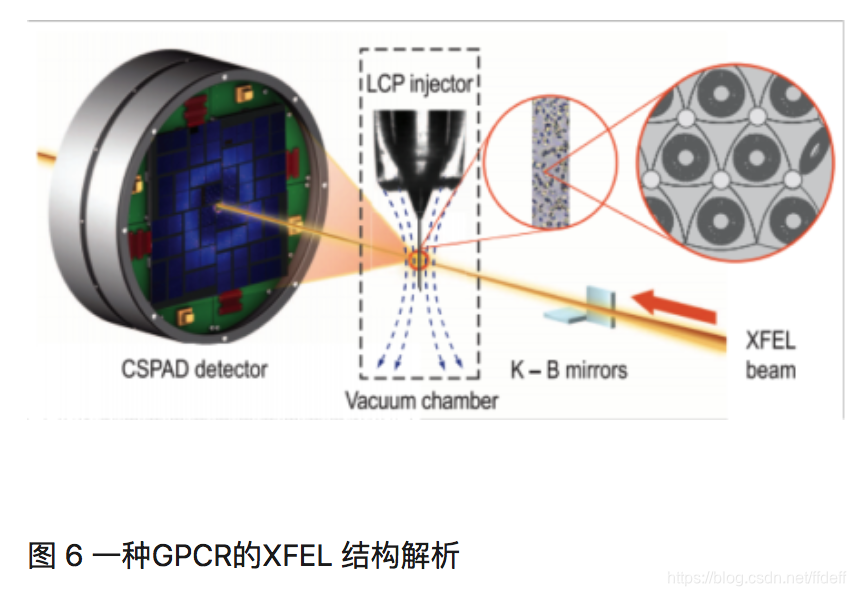 衍射图片具体产生过程如下,人话解释就是有一个喷头一直喷喷喷蛋白质晶体,然后很强的激光射向它,时间可控制在极小的数量级,最后从接收器上就得到了衍射图像。