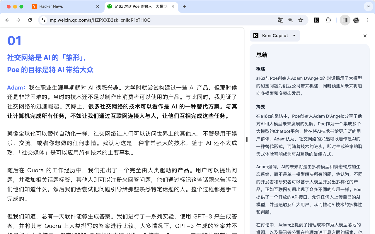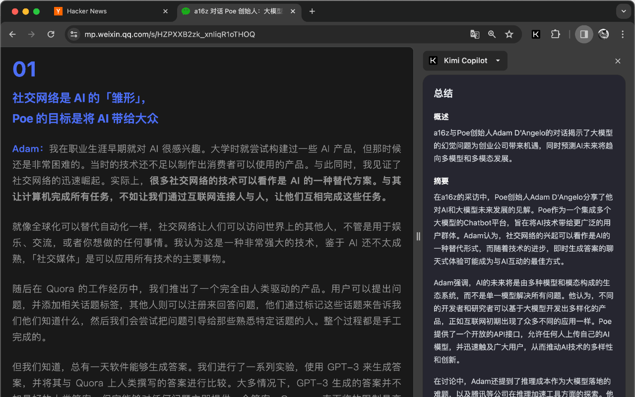 安装后,在浏览网络文章时点击插件图标,或使用快捷键 Ctrl/Cmd+Shift+K,即可一键召唤Kimi.ai总结网页内容.