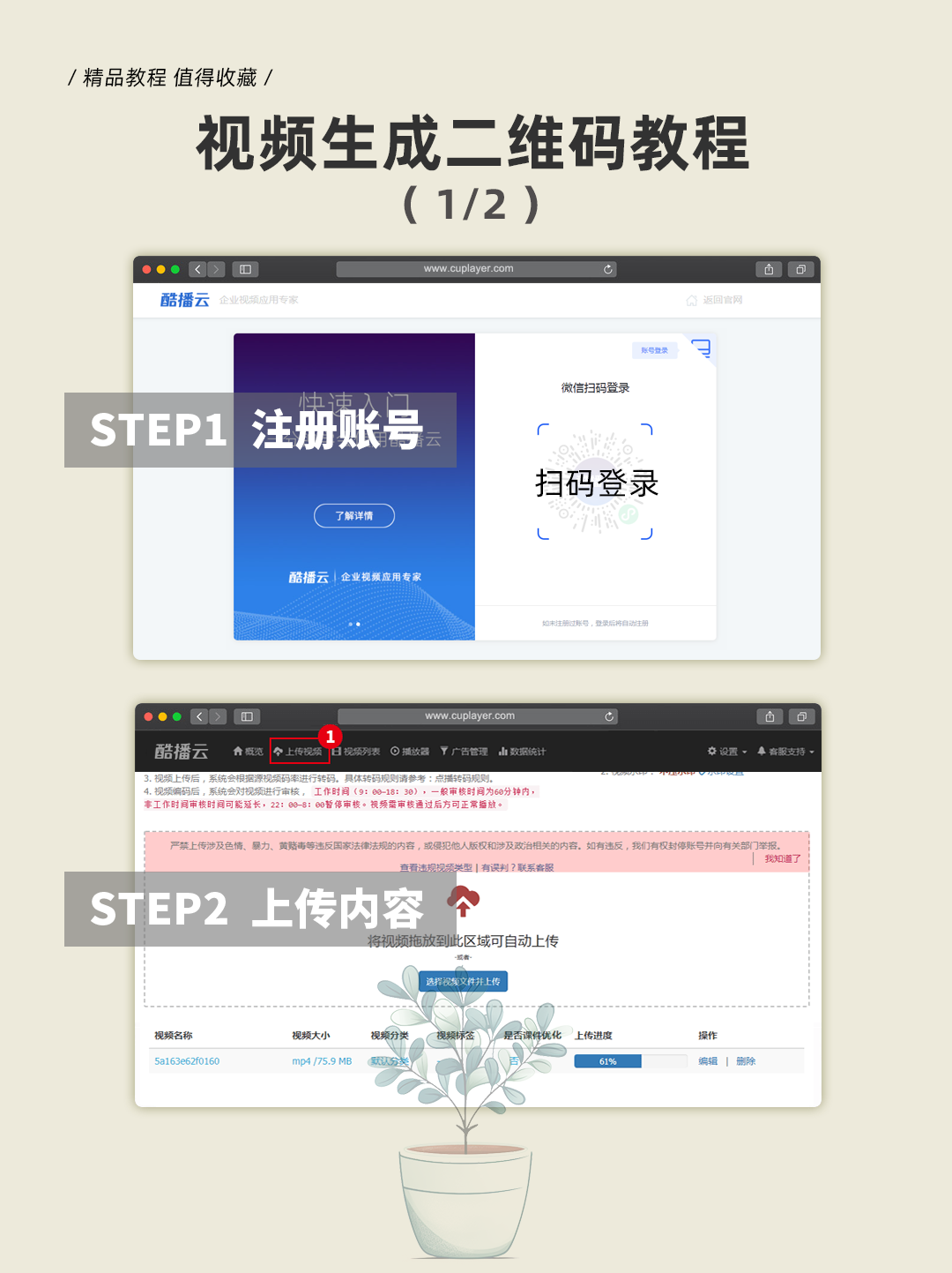 使用第三方云平台,直接上传视频,直接就生成二维码,下载和分享、印刷,就可以使用。教程如下。