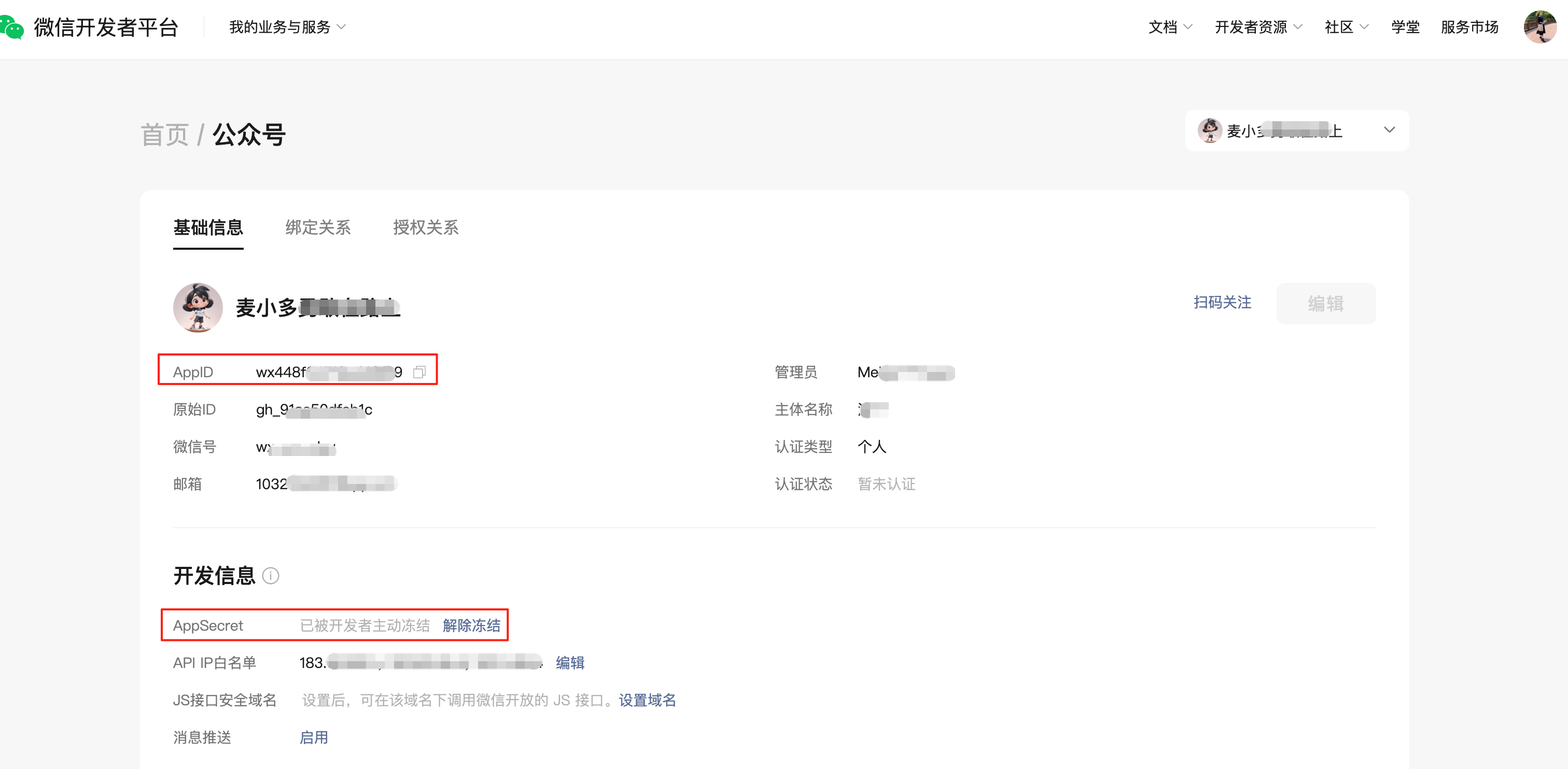 - 然后,进入详情页,即可查看 AppID 和 AppSecret 信息。并且可在此重置或者冻结/解除冻结 AppSecret。