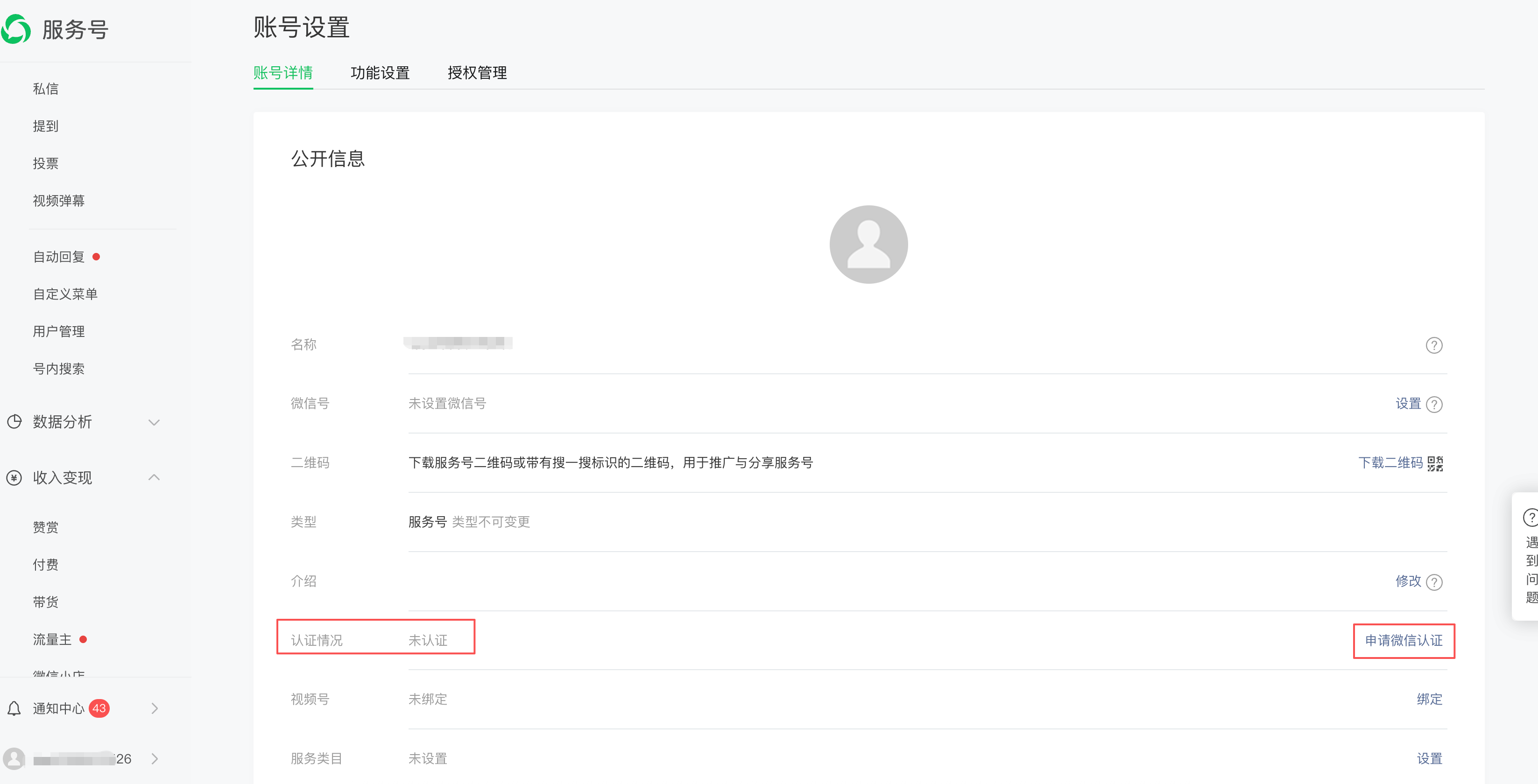 - 如何判断自己的账号是否完成了主体认证?可前往「微信公众平台 - 账号详情 - 认证情况」,如果显示未认证,则点击“申请微信认证”进行操作即可。如下截图: