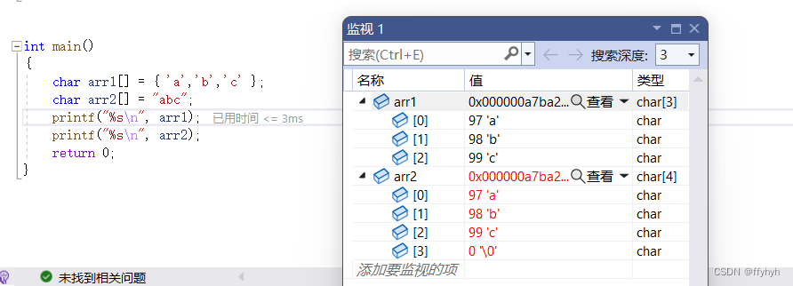 arr1和arr2很明显的区别就是1中只有3个字符和2中有4个字符(包括\0结束标识)