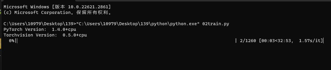 运行02train.py即可训练模型,这里深度学习的环境也是在python文件夹里面了,所以都不需要安装,直接运行即可。