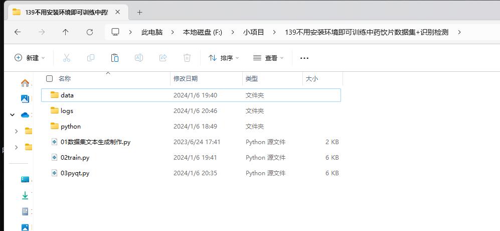 代码主要是data文件夹存放数据集,和3个py文件,分别用于运行01数据集制作,02训练模型,03pyqt的可视化ui界面。然后python文件夹存放的就是需要运行的python和深度学习pytorch的环境。