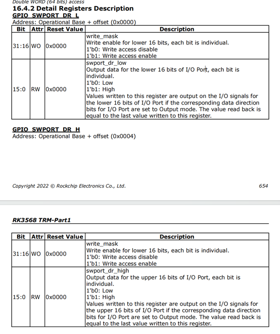 参考Rockchip_RK35xx_TRM_Part1,GPIO_SWPORT_DR_L:低位引脚数据寄存器,设置高低电平,GPIO_SWPORT_DR_H:高位引脚数据寄存器,设置高低电平。
