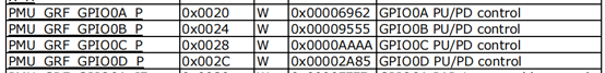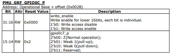 这个寄存器是控制引脚上下拉,操作的时候的基地址不是对应gpio控制器的地址了,而是pmu_grf的基地址。我们可以看到15和14位是针对gpio0c7的上下拉的,那么13到12就是针对gpio0c6的,以此类推。因为每个引脚的控制位占用两位所以读写控制位每个引脚也占用两位。Gpio0c7假如15和14位设置位weak1,则第31和30位都要设置为1才生效。