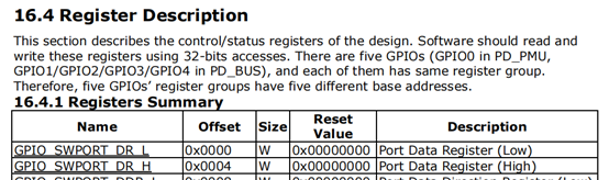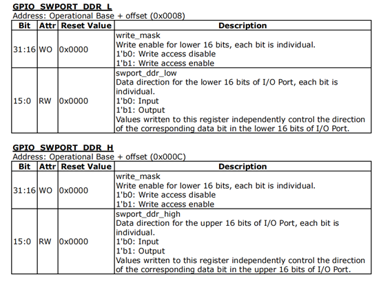 GPIO_SWPORT_DDR_L:低位引脚数据方向寄存器,控制输入或者输出。