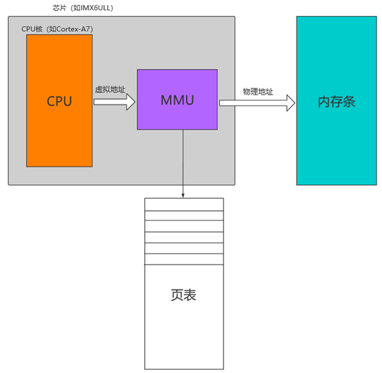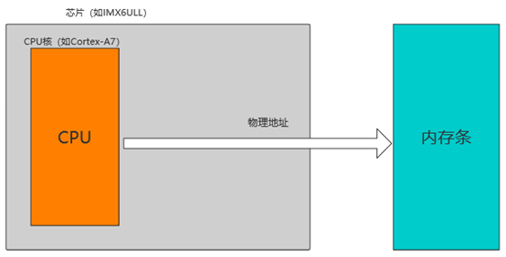 当没有启用MMU的时候,CPU在读取指令或者访问内存时便会将地址直接输出到芯片的引脚上,此地址直接被内存接收,这段地址称为物理地址, 如下图所示。