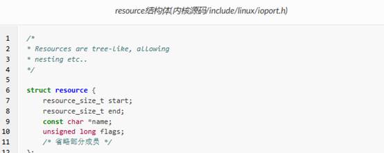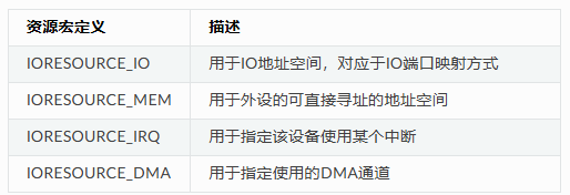 在内核源码/include/linux/ioport.h中,提供了宏定义DEFINE_RES_MEM、DEFINE_RES_IO、DEFINE_RES_IRQ和DEFINE_RES_DMA 。例如DEFINE_RES_MEM根据传入的起始地址_start和长度_size,自动计算结束地址,并将资源类型标记为内存资源。