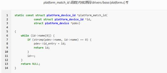 第四个if是id_table匹配,基于驱动的id_table(平台设备 ID 表)匹配。如果驱动定义了id_table(如led_pdev_ids),则调用platform_match_id,比较platform_device的.name和id_table中的.name是否有一致的条目。这个是以前没有设备树的情况下使用的,比较传统。