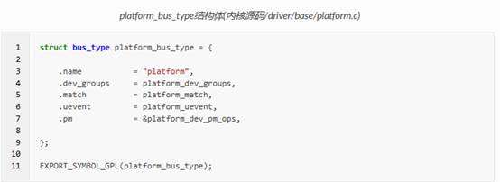 内核中使用bus_type来抽象描述系统中的总线,平台总线结构体原型如下所示: