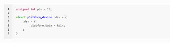 (这里我觉得说的不好)而对于软件信息,这种特殊信息需要我们以私有数据的形式进行封装保存,我们注意到platform_device结构体中, 有个device结构体类型的成员dev。在前面章节,我们提到过Linux设备模型使用device结构体来抽象物理设备, 该结构体的成员platform_data可用于保存设备的私有数据。platform_data是void *类型的万能指针, 无论你想要提供的是什么内容,只需要把数据的地址赋值给platform_data即可, 还是以GPIO引脚号为例,示例代码如下: